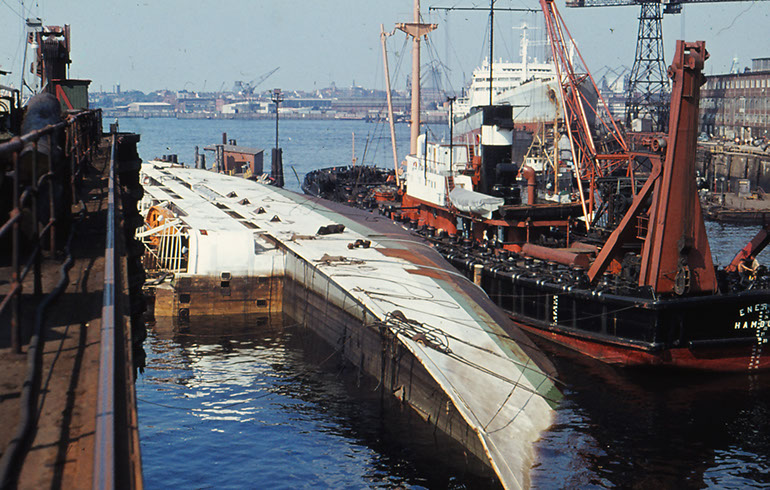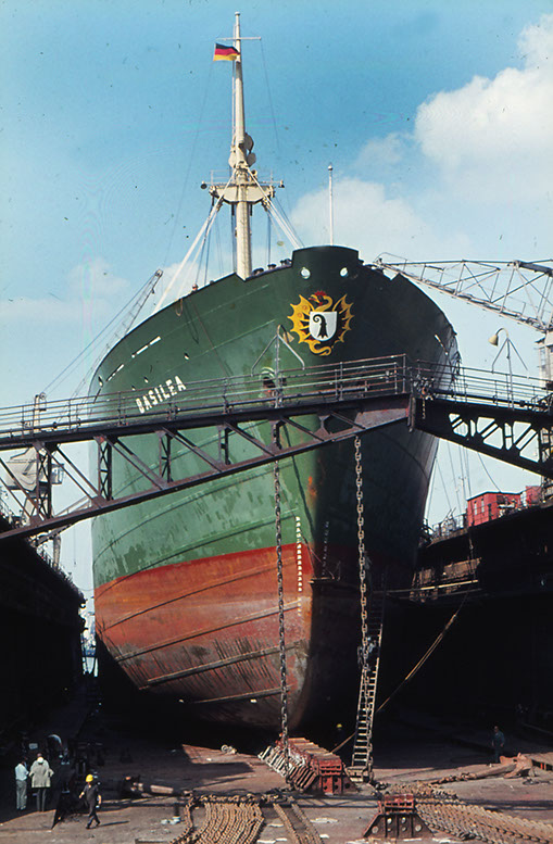 Die MS Basilea im Trockendock. Im Dock wirkt sie noch mächtiger als Im Wasser. Die Arbeiten dauern gut zehn Tage, bis zum 28. Juli 1964.