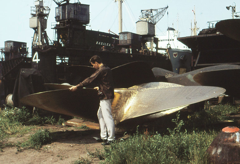Spannend, auf dem Gelände des Docks umherzustreifen. Motormann Otto Sauter staunt über die Grösse dieser Ersatzschraube.
