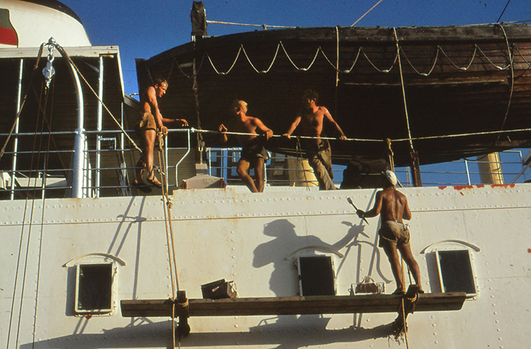 Die Arbeit als Messboy geht sofort los: Tagwache 6.00 Uhr. WC putzen, Kabinen aufräumen, Abwasch, Gänge putzen, Mittagessen servieren, abwaschen, Hilfsdienste in der Küche...