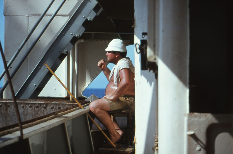 Bootsmann Bruno Schuchter, Chef der Deckmannschaft, der jeweils auch beim Laden und Löschen der Güter eine verantwortungsvolle Rolle spielt.