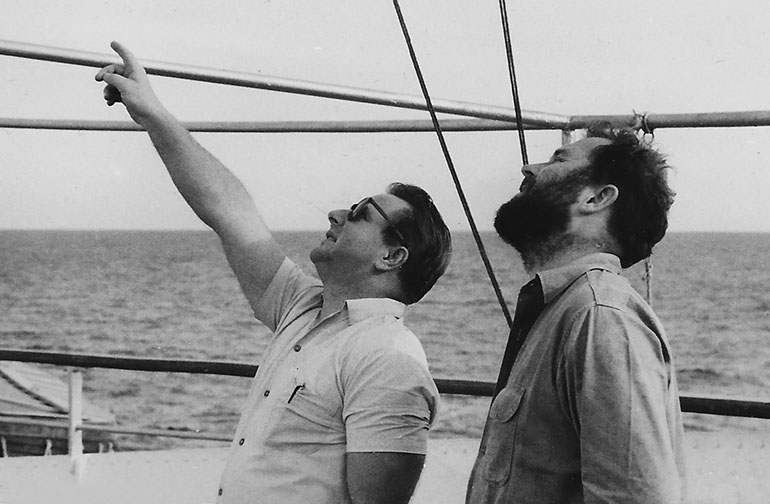 Der Zweite Offizier (der auf Frachtschiffen auch die Funktion des Mediziners an Bord innehat), Arthur Walser, links, und der Funker Bruno Maier.