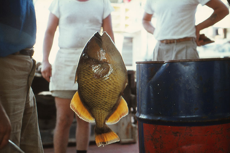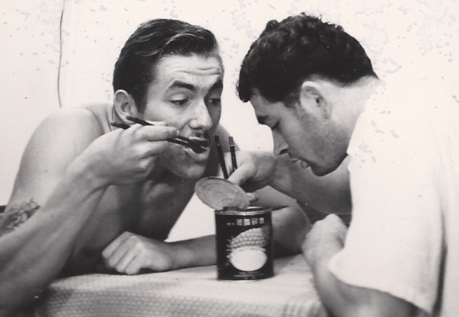 Die Maschinisten arbeiten unter Deck, kommen aber manchmal auch ans Tageslicht: Hier die beiden Motormen Robi Fiechter und Otto Sauter beim Ananas-Essen mit Stäbchen...