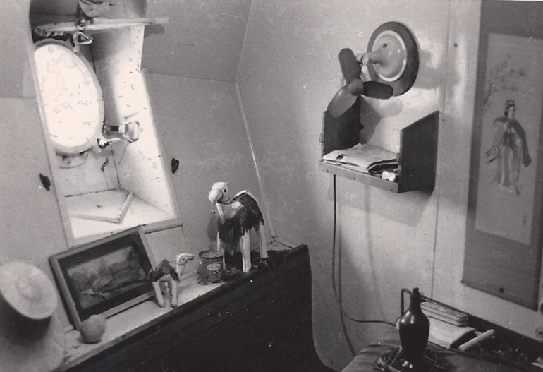 Die Mini-Kabine für zwei Messboys liegt achtern, direkt neben dem Ruderraum. Laut, eng, stickig. Zwei schmale Pritschen übereinander, kaum Platz zum Stehen daneben...