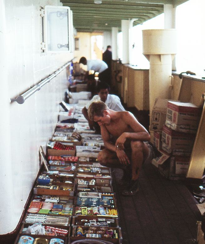 ...sondern vor allem nützliche Dinge für den Alltag, von Schuhbändeln bis Zahnbürsten. Die Besatzung der MS Basilea macht davon eifrig Gebrauch, für die Händler ein gutes Geschäft.