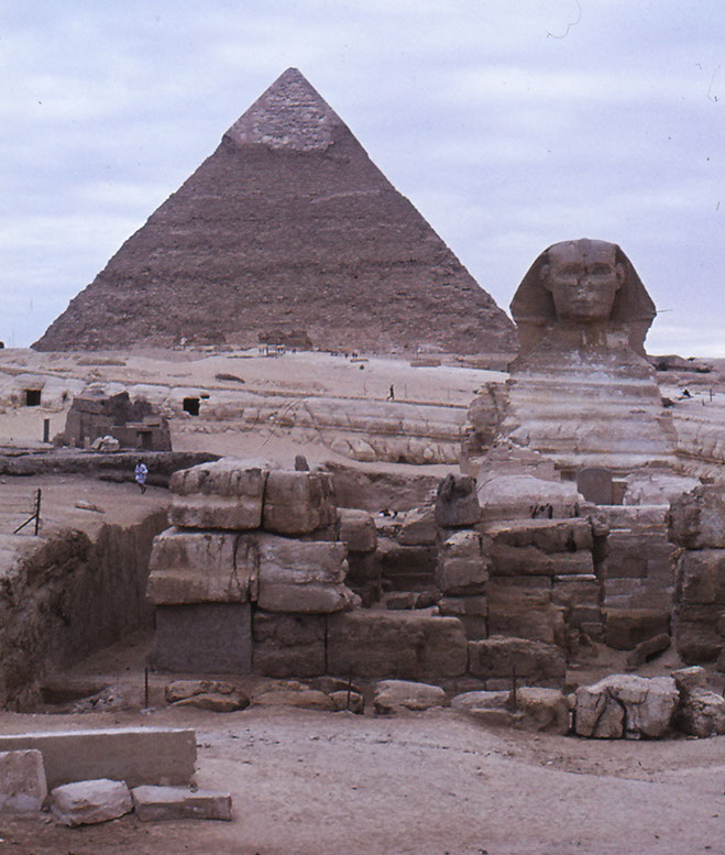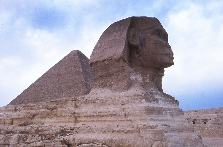 Der etwas lädierte Kopf des Sphinx – Napoleons Soldaten hatten die Statue um 1800 herum für Schiessübungen missbraucht... Im Hintergrund die Cheops-Pyramide.