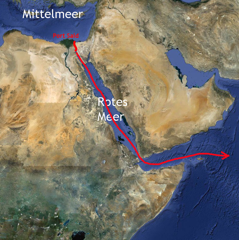 Die nächste Etappe steht an: Bei Port Said wartet der Suezkanal, dann gehts im Roten Meer weiter, mit einem Zwischenstopp in Französisch-Somaliland, in Djibouti.