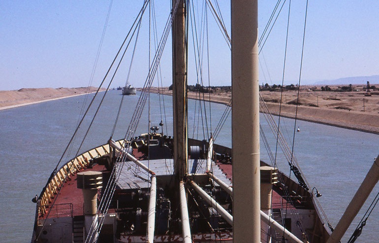 Die MS Basilea im Suezkanal. Links und rechts nichts als Wüstensand...