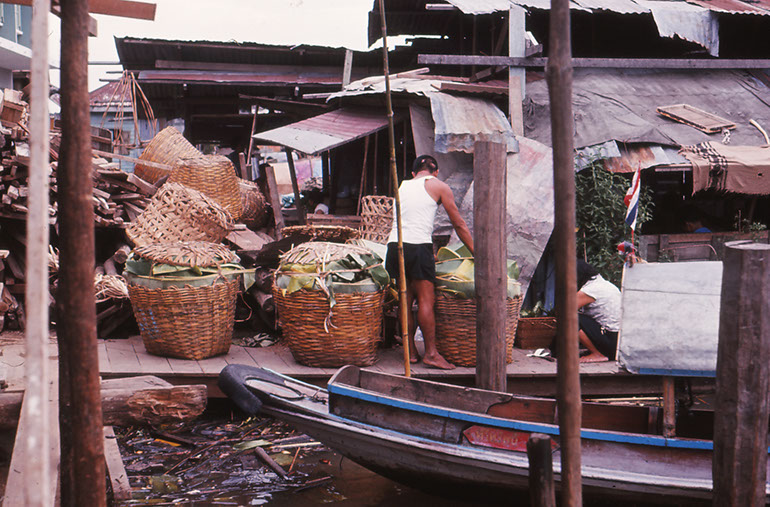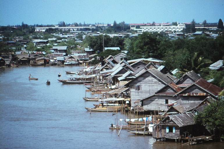Ein sehr einfaches Leben mit primitiven Hütten am Bangkok-River.
