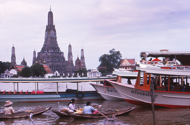Auf Bangkoks Fluss, dem Chao Phraya. Im Hintergrund eines der berühmtesten Wahrzeichen von Bangkok, der Wat Arun (Tempel der Morgenröte).