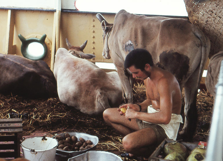 Aus den Matrosen und Deckjungen werden «Bauern», die täglich dreimal die Tiere füttern und tränken müssen. Die Mannschaft macht das mit Begeisterung und einer Portion Mitleid.