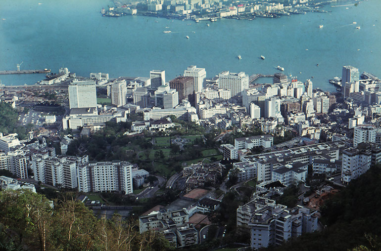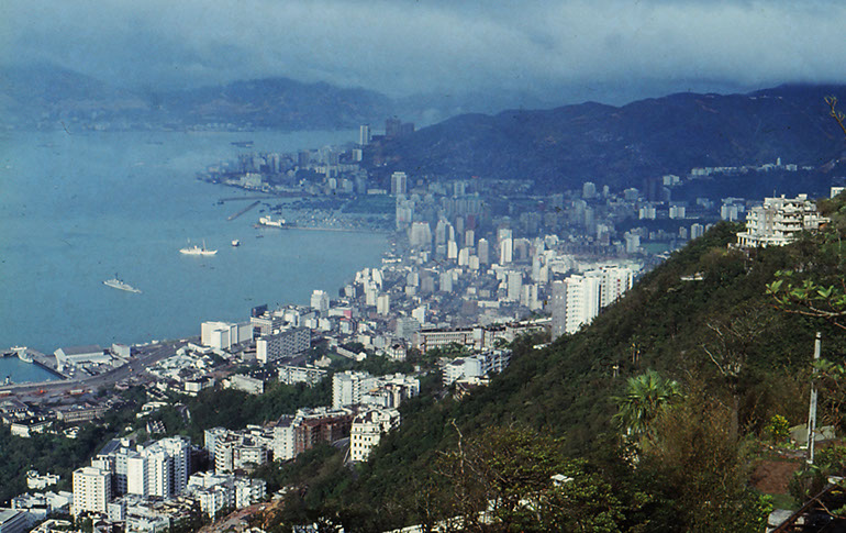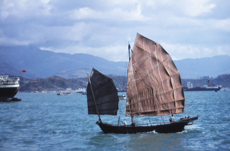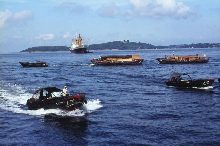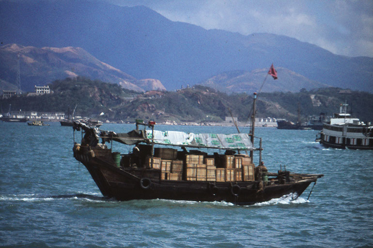 Hongkong! Die MS Basilea geht zwischen der Insel Hongkong und Kowloon vor Anker. Alles, was es zu löschen gibt, wird mit Dschunken und Lastkähnen abgeholt.