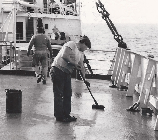 Das Karriereziel eines Deckjungen: Der Matrose. Hier der Vollmatrose Albin Vögtlin bei seiner Lieblingsarbeit: Streichen des Decks. Hinter ihm der Bootsmann, der Chef der Matrosen.