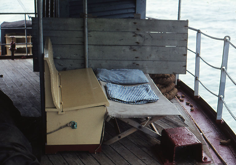 Die Mini-Kabine für zwei Messboys liegt achtern, direkt neben dem Ruderraum. Laut, eng, stickig. Zwei schmale Pritschen übereinander, kaum Platz zum Stehen daneben...