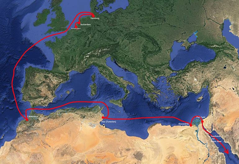 Die nächste Etappe steht an: Bei Port Said wartet der Suezkanal, dann gehts im Roten Meer weiter, mit einem Zwischenstopp in Französisch-Somaliland, in Djibouti.
