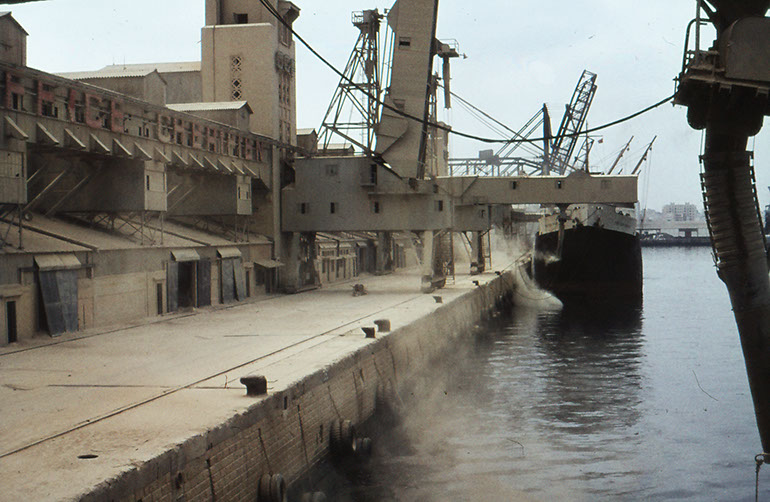 Phosphat ist ein Schüttgut und wird einfach in den Bauch des Schiffes gekippt. Mit Folgen: Alles ist weiss bedeckt, so wie das Pier hier, und die Messboys haben mit Putzen alle Hände voll zu tun.
