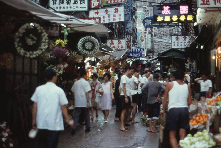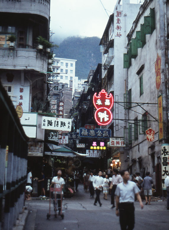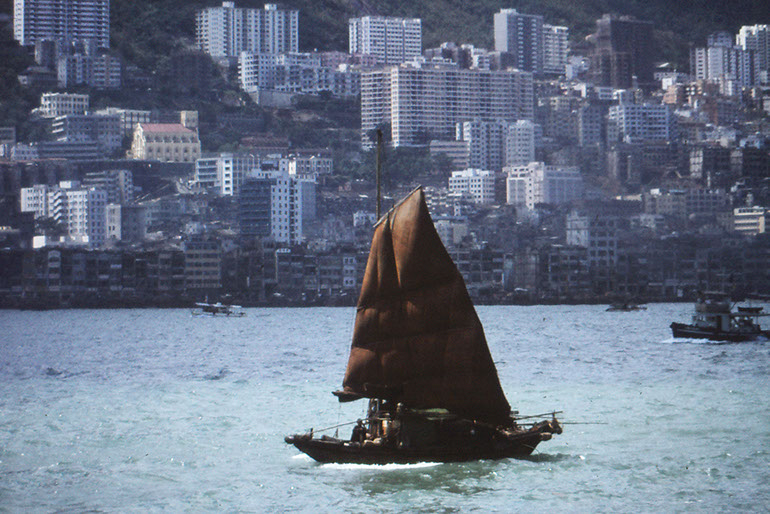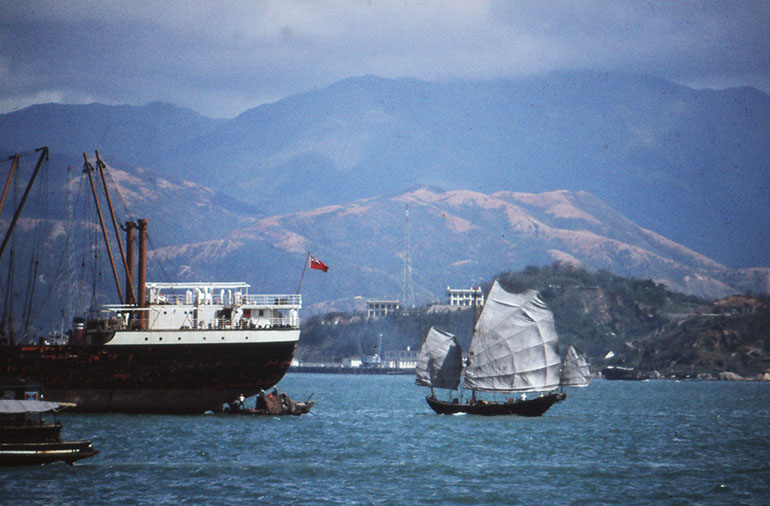 Hongkong! Die MS Basilea geht zwischen der Insel Hongkong und Kowloon vor Anker. Alles, was es zu löschen gibt, wird mit Dschunken und Lastkähnen abgeholt.