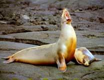 Die Seelöwen auf Galàgapos sind eine wahre Freude und öffnen das Herz jedes Besuchers. Besonders die Babys, wenn sie schreiend und klagend hinter der Mutter herwatscheln, die immer zu schnell unterwegs ist. Oder wenn man ganze Familien beobachten kann, wie sie sich genüsslich in ihren «Swimmingpools» räkeln und vergnügen, immer für eine verspielte Dummheit gut. Pure Lebensfreude. Dabei lassen sie sich auch nicht von badenden Touristen stören – im Gegenteil. Immer wieder haben wir beobachtet, dass sie aus dem Wasser stiegen und sich mitten unter die Leute an den Strand legten. Fehlte nur noch das Badetuch... Action gab es jeweils dann, wenn man einem Bullen ins Gehege kam. Schnorchler, die sich einer Familie zu sehr näherten, wurden dann vom starken Mann ganz bös angebrüllt und aus seinem Revier vertrieben.