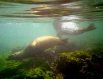 Wenn eine «nasse Landung» auf dem Programm stand, dann durfte auch das Schnorchelzeug nicht fehlen! Die Fischvielfalt hier kann sich nicht mit jener des Roten Meers oder der Malediven messen, dafür ist das Wasser zu kühl, aber dafür gibt es die einzigartige Möglichkeit, unter Wasser mit den jungen Seelöwen zu tanzen! Reinspringen genügt, schon wollen sie mitmachen und ihre Schwimmkünste vorführen, diese verspielten Süsslinge! Ich war mal mitten in einem Rudel von sechs Halbwüchsigen, die wie Torpedos gleichzeitig von unten und oben an mir vorbei zischten – jedesmal die Augen weit offen und mich betrachtend. Wahrscheinlich mitleidig, weil ich mich im Wasser so ungeschickt benahm, verglichen mit diesen Akrobaten. Eine umwerfende Erfahrung!