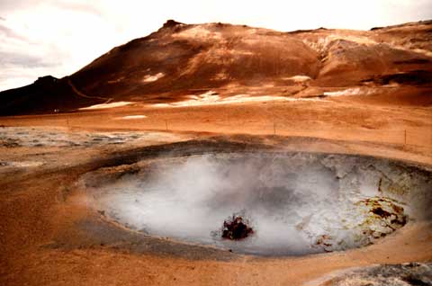 Durch Islands Gesteinsmassen hindurch ziehen sich kilometerlange Spalten, an denen die «Haut» besonders dünn ist. Dort trifft man immer wieder auf Höhlen, die heisses Wasser führen. Ganz Island wird mit geothermischer Energie geheizt, die die Menschen aus dem Erdinnern holen. Dafür sind Bohrungen von bis zu ein paar Kilometern nötig, um an den heissen Dampf zu gelangen, der Turbinen für die Elektrizitätsgewinnung treibt oder als Wärme für Fernheizungen verwendet wird. «Abfallprodukte» solcher Energiewerke sind Seen mit rund 40-grädigem Wasser, in denen die Leute das ganze Jahr über baden können. Da das Wasser schwefelhaltig ist, stinkts ziemlich penetrant nach Hölle, aber es soll dafür gesund sein und Schuppenflechte und dergleichen heilen. Natürlich haben wir uns auch in einen solchen See gewagt – und dann zwei Tage später noch den Schwefelgestank auf unserer Haut gerochen.