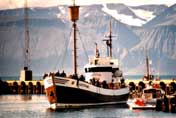 Wir wollten natürlich auch wissen, wie sowas abläuft und entschieden uns für einen Ausflug im nördlichen Fjord von Husavik. Unser Schiff war ein formschöner, guter alter Fischerkutter aus Eichenholz, Baujahr 1960, und umgebaut für solche touristischen Ausflüge, bei denen etwa 40 Personen auf Deck Platz finden. Gemäss Werbeprospekt trifft man in 99% aller Ausfahrten auf Wale. Die scheinen sich von diesen Booten nicht gross stören zu lassen und haben erkannt, dass ihnen von diesen keine Gefahr droht. Allerdings braucht es trotzdem Glück, etwas Besonderes zu sehen, denn die 99% Treffsicherheit gründet auf der Sichtung von Zwergwalen, von denen man meist nur die Rückenflosse sieht...