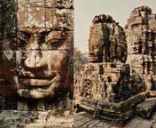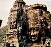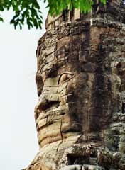 Schon von ausserhalb gucken die Gesichter weise und gelassen lächelnd auf die Menschen herab, die neben ihnen winzig klein und nichtig erscheinen. Lange hatte man angenommen, dass diese Gesichter einen Hindugott darstellen (z.B. Brahma, den Schöpfer der Welt, oder Shiva, den Zerstörer und Wiederaufbauer), aber dann fand man 1924 eine buddhistische Figur im Tempel, die mit den Gesichtern in Verbindung gebracht werden konnte. Seither nimmt man an, dass es sich um einen Bodhisattva handelt – so nennt man ein buddhistisches Wesen, das die höchste Stufe auf dem Weg zur Erleuchtung erreicht hat und damit eigentlich ins wunschlos glücklich machende Nirvana eintreten könnte - was ja das Ziel der Buddhisten ist. Ein Boddhisattva aber will diesen Schritt noch nicht vollziehen und bei den Menschen bleiben, um ihnen bei der Suche nach der ewigen Glückseligkeit zu helfen. Wenn man die feinen Züge der Gesichter anschaut, die allesamt dieses weise Lächeln auf den Lippen haben, ist man versucht, dieser Darstellung zu glauben...