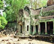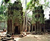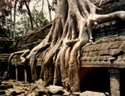 Im Osten von Angkor Thom liegt die besonders eindrucksvolle Tempelstadt Ta Prohm, die die Archäologen der «Ecole Française d’Extrème Orient» genau sobelassen haben, wie man sie bei der «Wiederentdeckung» um 1863 angetroffen hatte, nämlich vollkommen überwuchert von mächtigen Wurzelbäumen, die die Stadt fest im Griff haben (Würgefeigen heissen die Bäume, was für ein passender Name!). Einerseits zerdrücken und zermalmen die gewaltigen Fangarme alle Bauwerke, anderseits stabilisieren sie die Ruinen auch wieder. Würde man die Wurzeln entfernen, so bräche alles endgültig in sich zusammen. So aber ist eine wahre Symbiose von Architektur und Natur entstanden, wirklich beeindruckend – und hier kommt jetzt das Dschungel- und Abenteuergefühl tatsächlich auf. Auch wenn man Abends dann wieder ins klimatisierte Hotel zurückkehren darf. Das war bei den weissen Entdeckern Mitte des 19. Jahrhunderts noch anders. Die mussten sich echt im Dschungel beweisen und sind reihenweise gestorben, an Erschöpfung, an Malaria, an Thyphus. Sogar Tiger gab es damals noch und Krokodile sowieso.... es lebe der gefahrlose heutige Tourismus!