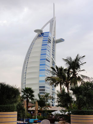 Weil Dubai offenbar nicht genug Land hat, baut man jetzt dort ins Meer hinaus. Von den sagenhaften künstlichen Inseln hat man schon längst gehört. Mit eigenen Augen gesehen haben wir sie allerdings nicht, denn aus unserer Froschperspektive vom Ufer aus sind sie nicht zu erkennen, vom weit entfernten 800-Meter-Turm «Burj Khalifa» aus konnten wir sie nicht sehen, weil es zu diesig war, und unser geplanter Helikopterflug fiel ins Wasser, weil gerade ein Sandsturm wütete und man die Helis diesem nicht aussetzen wollte.