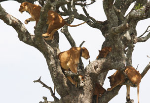 Nur wenig später staunen wir nicht schlecht, als wir einen Baum voller Löwen entdecken! Zuerst hängen sie nur faul in den Ästen, aber dann beginnen sie drin rumzuklettern wie die Affen, und beim genaueren Hinsehen merken wir, dass sich sogar Babies im Baum aufhalten. Eine einmalige Trouvaille!