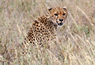 Also: Was fehlt uns noch? Richtig: einen Cheetah (Gepard) haben wir noch nicht angetroffen. Wir scherzen im Auto: Den sehen wir doch noch auf der Fahrt zum Flugzeug! Das glauben wir natürlich selber nicht, aber das Unmögliche geschieht. Kurz vor dem Erreichen des Flugfeldes kommt wieder eine Funkmeldung herein: Cheetah im offenen Gras! Unser Fahrer weiss offenbar genau, an welcher Stelle, wir rasen dort hin. «Macht nichts, wenn wir zu spät zum Flieger kommen, die haben eh immer Verspätung», meint er cool. Und dann zeigt er auf irgendeine Stelle im Gras und sagt: «Dort ist er!». Wir sehen nichts, absolut nichts, so gut ist er getarnt im hohen, trockenen Buschgras. Aber dann tut er uns den Gefallen und hebt seinen Kopf, zeigt sich in voller Grösse. Unser Cheetah! Unglaublich, auch den noch...