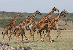 Schon in den ersten Stunden treffen wir auf eine Herde von Giraffen, die unseren Weg kreuzt. Eine solche Menge von Giraffen auf einmal haben wir noch nie gesehen! Es sind sicher 60, 70 Tiere, ganze Familien mit ihren Babies. Einmalig elegant.