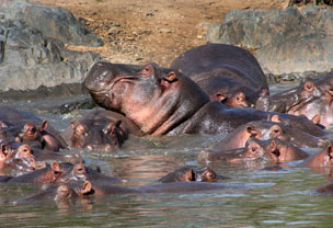 Heute steht ein voller Tag für Gamedrives auf der Liste, aber nach der gestrigen Gewaltsfahrt entscheiden wir uns für ein leicht abgespecktes Programm und begnügen uns mit einer fünfstündigen Pirschfahrt, so, dass wir zum verspäteteten Lunch wieder im Camp sind. Wir haben Glück und treffen auf echte Attraktionen. Zuerst sichten wir einen Fluss, vollgepfercht mit schnaubenden und streitenden Hippos, dann laufen uns Elefanten und Giraffen über den Weg.