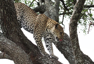 Aber nicht genug damit: Kurz bevor wir den Heimweg antreten, bekommen wir einen Funkspruch von anderen Jeeps mit: Leopard gesichtet! Es kommt Hektik auf, und unser Fahrer drückt aufs Gas. Wir sind der dritte Jeep, der sich unter den entsprechenden Baum manövriert, und dann starren wir gebannt auf dieses seltene und wunderschöne Tier, nur ein paar Meter von uns entfernt. Sieben Safaris lang (meine erste war 1984 in Kenia), habe ich nie einen Leoparden zu Gesicht bekommen, und nun, was für ein erhabener Moment! Mir kommt jener Ranger in Namibia in den Sinn, der vier Jahre lang dort tagtäglich professionell unterwegs war und nie einen Leoparden sah! Unsere Katze auf dem Baum wird langsam unruhig, die wachsende Wagenkolonne stört sie ganz offensichtlich – inzwischen haben sich bereits sieben Jeeps mit Dutzenden von klickenden Bewunderern eingefunden – sie findet «es reicht», steigt ohne jede Hektik vom Baum und verschwindet, geschmeidig unter einem Jeep hindurch, im Busch auf der anderen Strassenseite. Wir haben unseren Leoparden gesehen! Wir! Was für ein Schwein!