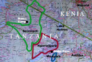 Eine lange Wegstrecke steht bevor: Von der Gibbs-Farm (östlich des Ngorongoro-Reservats) bis quer durch die beiden Parks in unsere neue Lodge, die westlich der Serengeti liegt.
