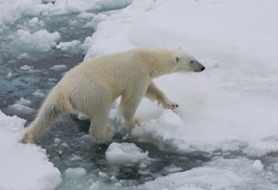 Noch während wir am Frühstück sind, vernehmen wir über die Bordlautsprecher den ersten Bären-Alarm – jetzt kommt Hektik auf! Alle stürzen in die Kabine und machen sich zodiac-bereit: Warme Kleidung, Schwimmweste, Stiefel, Kameras... Dann gehts im Eiltempo in die Gummiboote. Die Bärin mit ihrem Jungen ist inzwischen hinter einem Hügel verschwunden, wir setzen nach, sehen sie dann von Eisscholle zu Eisscholle springen, kommen aber nicht nahe genug an sie heran. Aus 2-300 Meter Entfernung verfolgen wir sie mit dem Fernglas. Sie mögen allerdings unseren Besuch nicht besonders und lassen sich ins Wasser gleiten – Ende der Vorstellung.