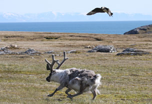 Alle scheinen gut aufgepasst zu haben bei der Einweisung, alle gelangen wohlbehalten ins Gummiboot und schwingen sich dann gekonnt – Rücken zum Land, wie gelernt – ans Ufer, und dank unseren kniehohen Gummistiefeln sogar trockenen Fusses! Das erste Land, das wir dergestalt betreten, liegt in einer Bucht namens Blomstrand im Kongsfjord. Nun wissen wir auch, warum man uns dringend geraten hat, auf Bergschuhe zu verzichten und auf Gummistiefel zu setzen: das Land ist ein richtiger Pflotsch. Normalerweise ist es ja gefroren (Permafrost), aber jetzt im Sommer taut es langsam auf und versetzt die Tundra in einen veritablen Sumpf! Wir treffen aber auch auf verlassene und verlotterte alte Hütten, die um 1920 herum einigen Abenteurern als Arbeitsstätte und Wohnung gedient hatten. Sie hatten hier versucht – ohne grossen Erfolg – Marmor abzubauen. Von Eisbären weit und breit keine Spur, nur ein einsames Rentier bekommen wir zu Gesicht, und ein paar Küstenseeschwalben finden unseren Besuch gar nicht lustig und attackierten uns im Sturzflug.