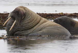 30. Juni. Auf dem Prins Karls Forland sichtet der Captain von seiner Brücke aus eine Walross-Familie. Unsere Reiseleiter beschliessen, die Zodiacs ins Wasser zu lassen. Alle sind Feuer und Flamme. Die Frage ist nur: lassen uns die Tiere nahe genug an sich ran? Unsere Arktiskenner sind gewievte Taktiker. Sie ordnen an, dass unsere 50-köpfige Gruppe nach der Anlandung mit den Zodiacs in etwa 500 Meter Entfernung geschlossen und sorgfältig auf die Walross-Familie zu geht. Keiner spricht ein Wort, wir bemühen uns, ganz ruhig zu gehen, was nicht einfach ist, denn das Wandern im Geröll am Ufer macht einen beträchtlichen Krach.